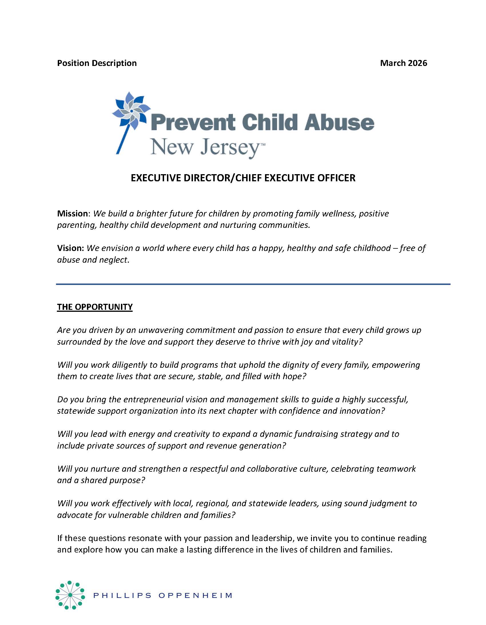 The Executive Director/Chief Executive Officer (CEO) of Prevent Child Abuse-New Jersey is hired and retained by the Board of Directors and reports directly to the Board. The Executive Director/CEO is responsible for the vision, development, oversight, and implementation of the goals and policies of PCA-NJ as approved by the Board of Directors.
