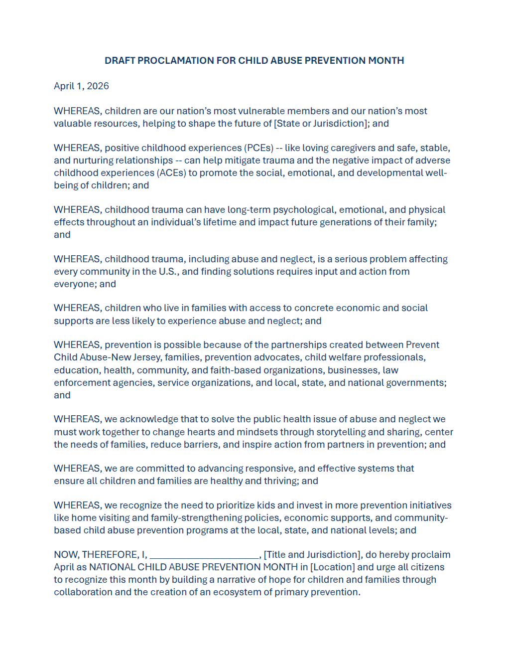 You can help promote happy and healthy childhoods by reaching out to the municipality or county where you reside and requesting a Mayoral of Board of County Commissioners proclamation, declaring April as Child Abuse Prevention Month. Kindly let us know if you’ve submitted that request. Please see and share the suggested wording we are providing.