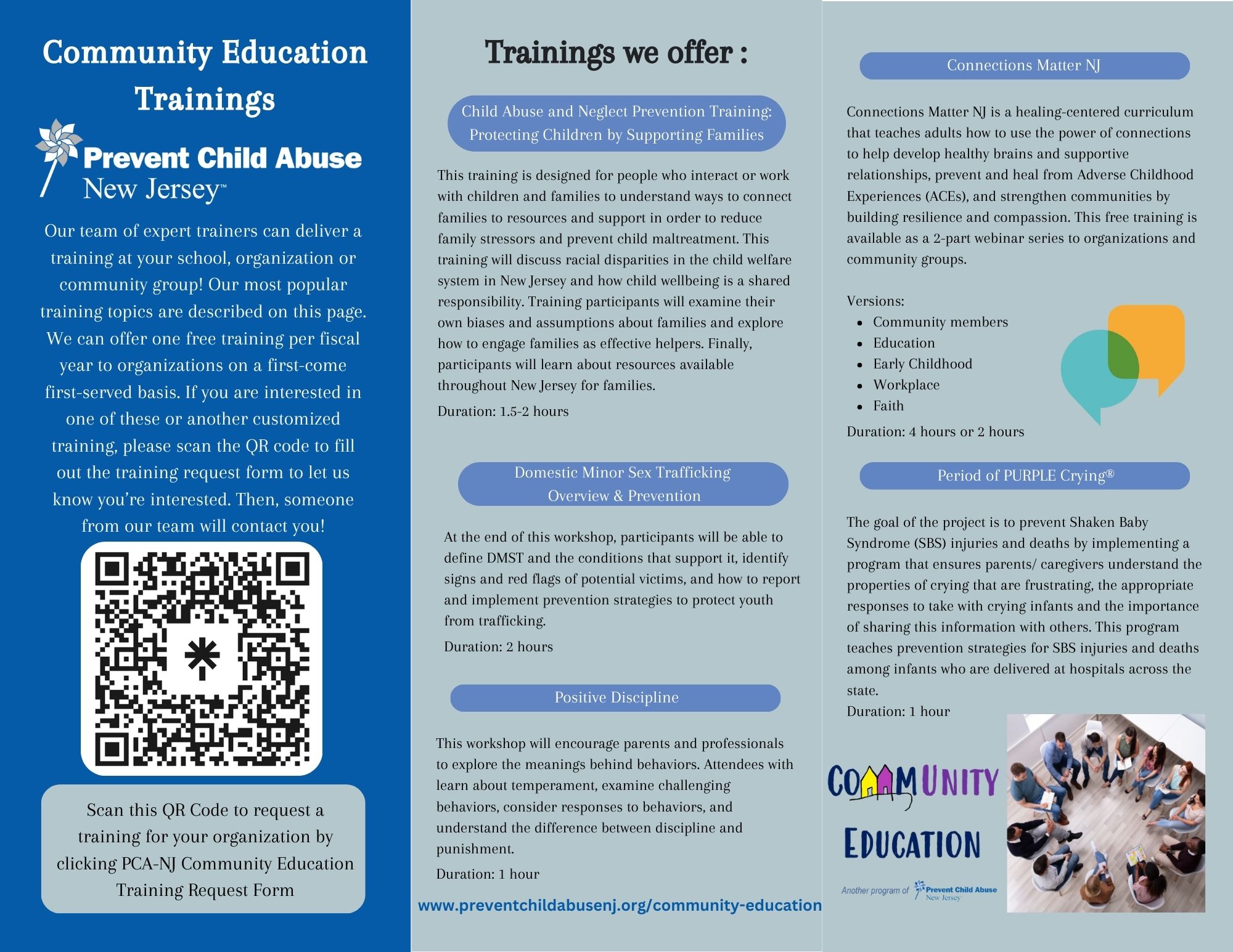 The Community Education Department provides information to parents and caregivers, the general public and professionals who work with children and families to build a brighter future for children and to educate them about preventing child abuse and neglect.